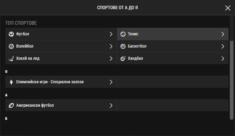 За да видите всички спортове, които се предлагат в момента, трябва да цъкнете на секция „Спорт“. За да видите цялата гама от предлагани спортове, трябва да отидете на „от А до Я“. Както се вижда и на снимката, най-отгоре ви излизат по-популярните спортове, а по-надолу са подредени по азбучен ред всички спортове, предлагани от Bwin. В следващите редове ще видите всички спортове, на които може да се залага:
