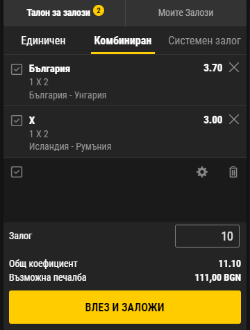 Голямо улеснение е, че долу, под „Залог“, Ви се изписва общия коефициент от избраните събития и потенциалната печалба според сумата, която залагате. Така не е нужно да смятате допълнително на калкулатор.