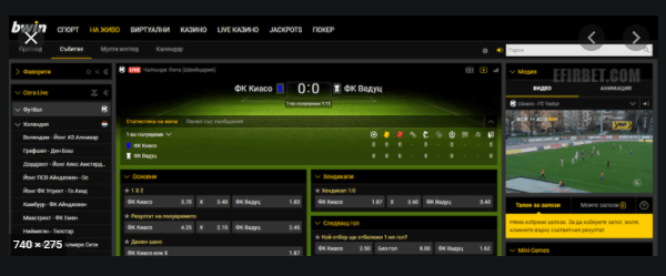 Както се вижда, имаме главна лента за навигация, която показва различните предложения на букмейкъра, под нея виждаме втора такава, в която виждаме актуалните предложения и популярните спортове. В центъра на екрана се намират актуалните промоции, а под тях виждаме live-секцията. Подобно на голяма част от спортните сайтове, в дясната част на екрана се намира секцията, в която човек подрежда своя фиш.
